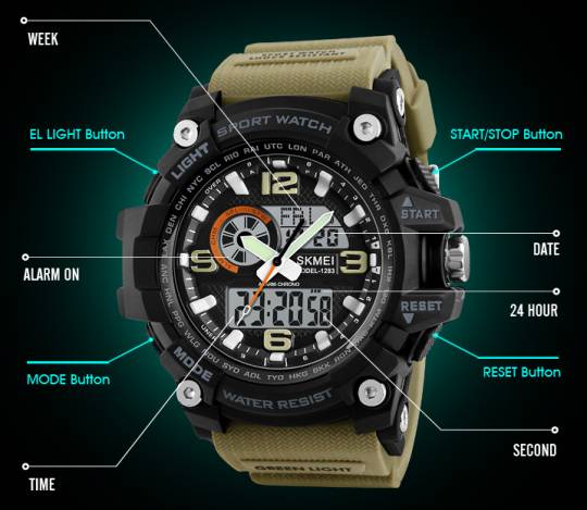 Λειτουργίες: Αυτόματη Ημερομηνία, Repeater, Alarm, Χρονογράφος, Οθόνη LED, Shock Resistant, Χρονόμετρο, 12h/24h, Φωτισμός οθόνης