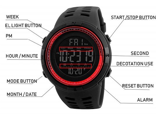 Λειτουργίες: Αυτόματη Ημερομηνία, Repeater, Alarm, Οθόνη LED, Shock Resistant, Χρονόμετρο, 12h/24h, Οπίσθιος φωτισμός πλήρους οθόνης