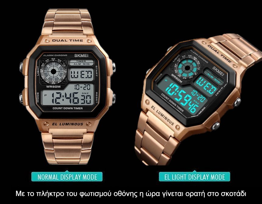 Λειτουργίες: Αυτόματη Ημερομηνία, Repeater, Alarm, Οθόνη LED, Shock Resistant, Χρονόμετρο, 12h/24h, Οπίσθιος φωτισμός πλήρους οθόνης