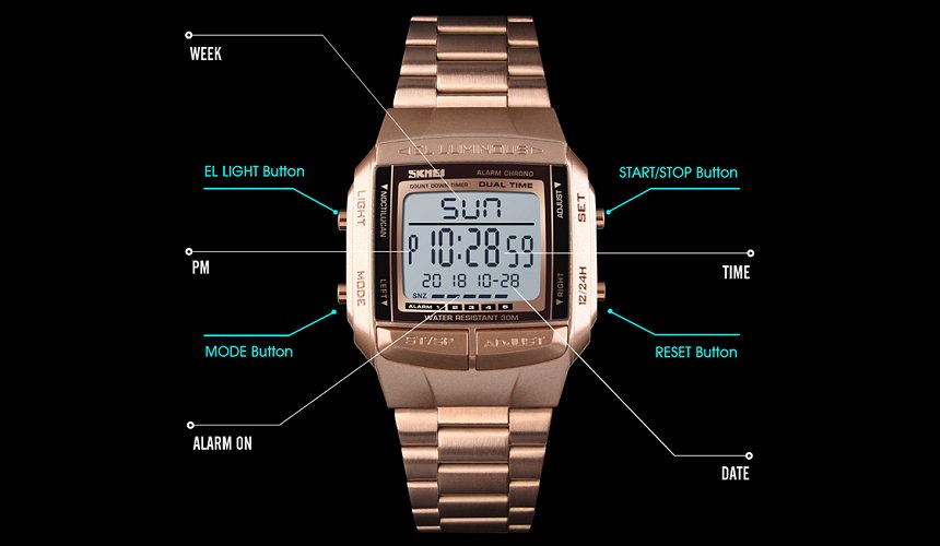 Λειτουργίες: Αυτόματη Ημερομηνία, Repeater, Alarm, Οθόνη LED, Shock Resistant, Χρονόμετρο, 12h/24h, Οπίσθιος φωτισμός πλήρους οθόνης
