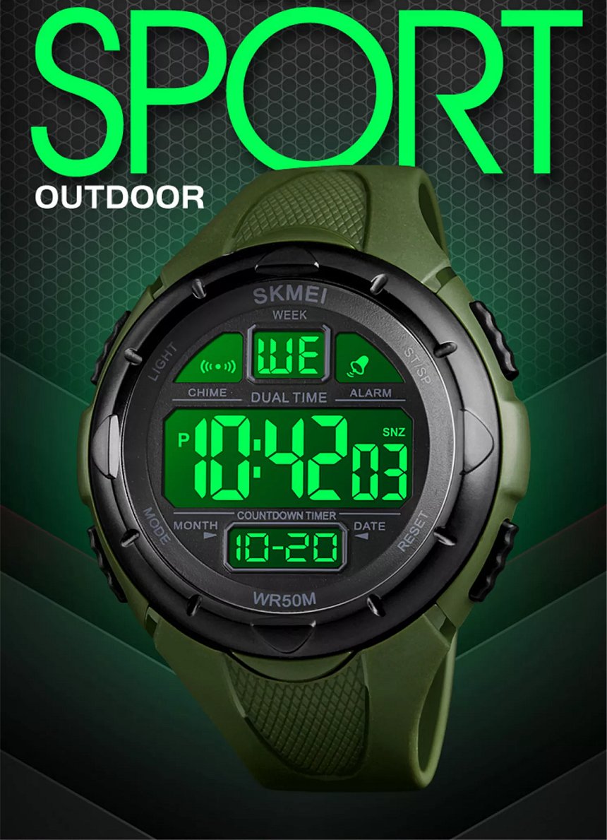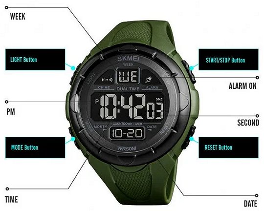 Λειτουργίες: Αυτόματη Ημερομηνία, Repeater, Alarm, Οθόνη LED, Shock Resistant, Χρονόμετρο, 12h/24h, Οπίσθιος φωτισμός πλήρους οθόνης