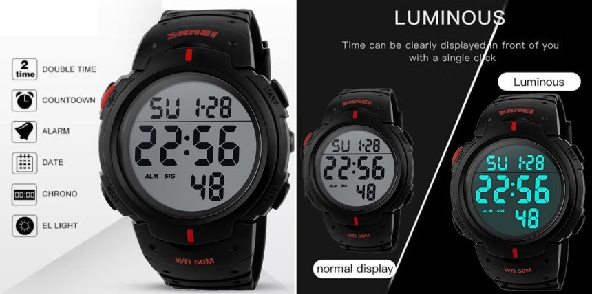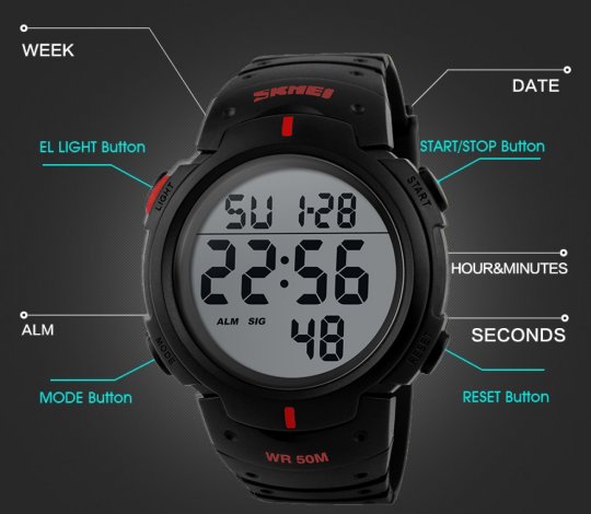 Λειτουργίες: Αυτόματη Ημερομηνία, Repeater, Alarm, Οθόνη LED, Shock Resistant, Χρονόμετρο, 12h/24h, Οπίσθιος φωτισμός πλήρους οθόνης