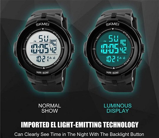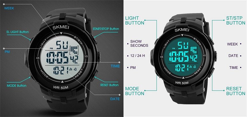 Λειτουργίες: Αυτόματη Ημερομηνία, Repeater, Alarm, Οθόνη LED, Shock Resistant, Χρονόμετρο, 12h/24h, Οπίσθιος φωτισμός πλήρους οθόνης